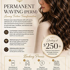 ✨ PERMANENT WAVING (PERM) Luxury Texture Transformation Enhance your natural beauty with soft waves, defined curls, or full-volume transformation. Our permanent waving service is customized to your hair type, condition, and desired style for the best results. ✔ Customized Consultation Required Please send clear photos of your current hair (front, side, and back) along with your desired look for an accurate quote. ✔ Premium Quality Guarantee We use high-quality products and advanced techniques to ensure healthy, long-lasting results. ✔ Personalized for You Every service is tailored — no two perms are the same. Starting at $250+ (Final price varies based on hair length, thickness, and desired style) ⸻ 💬 Booking Process 1. Send photos of your current hair 2. Share your inspiration look 3. Receive a personalized quote 4. Book your appointment ⸻ ✨ Optional Add-On (if you want to upsell) Deep Conditioning Treatment – Recommended to maintain softness and shine after perm Royal Escape Day Spa 19383 Soledad Canyon Road Santa Clarita CA 91351 www.royal-escape.com 661-6660190